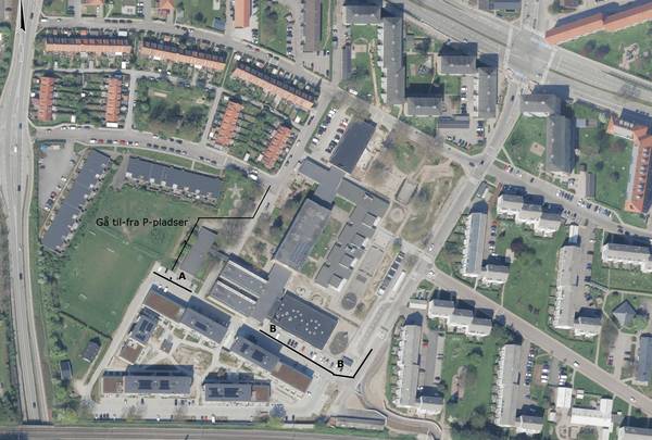 Der er ofte ledige pladser om aftenen og i weekenden - især for enden ved boldbanen/klubben, og man kan gå langs med skolen og klubben hen til hjørnet på Engskolevej, se planen.